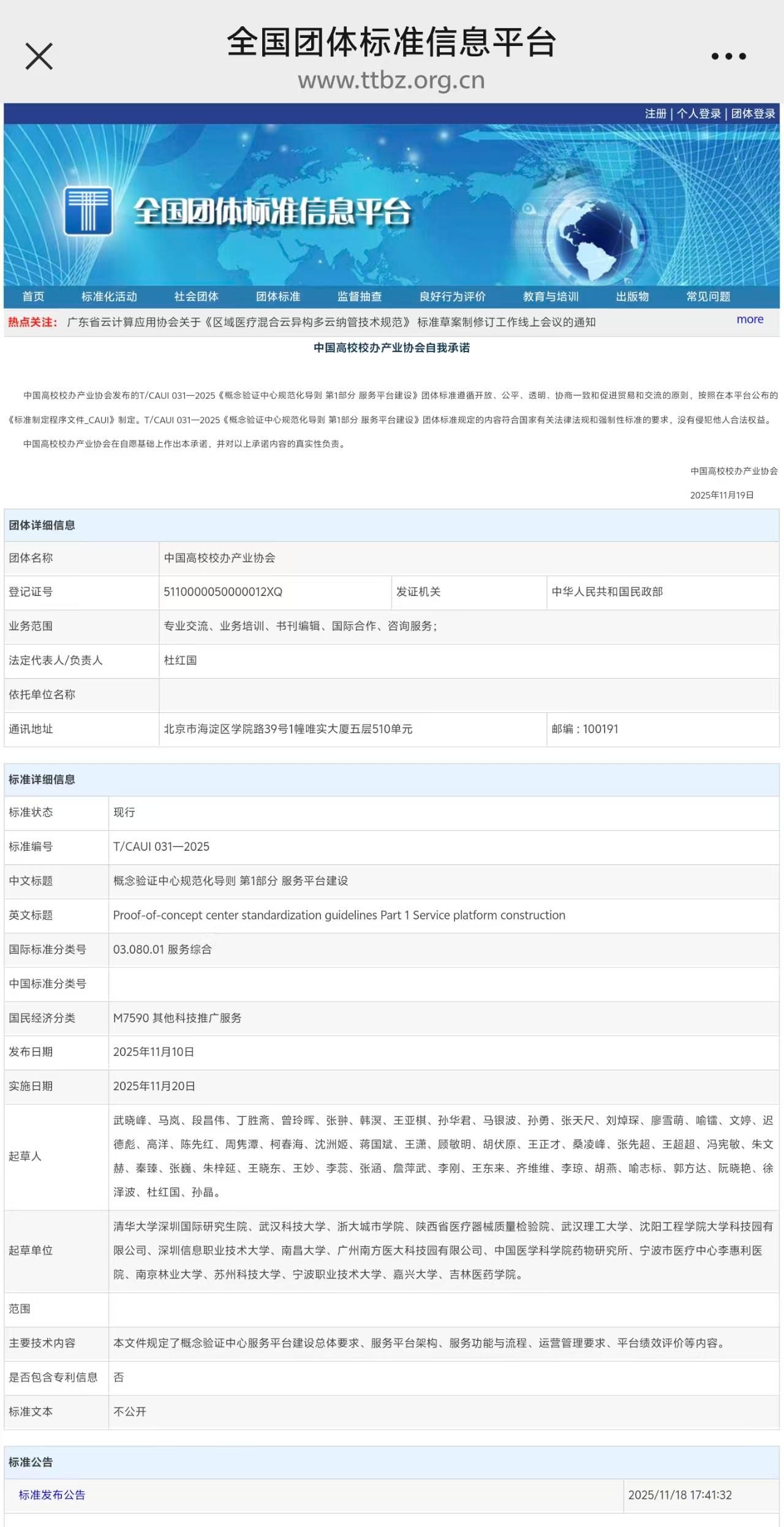 近日,我国在科技成果初始转化阶段的标准体系建设取得重要进展——团体标准《概念验证中心规范化导则第1部分:服务平台建设》正式发布。在该标准的制定工作中,武汉科技大学凭借在科技成果转化与创新服务领域的扎实积累与前瞻实践,入选核心起草单位,并在全部16家参与机构中综合排名第二,充分体现了学校在概念验证领域的影响力与贡献度。